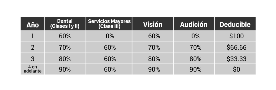 • Opciones de deducible: $0, $50 o $100, con suspensión total del deducible en el cuarto año.